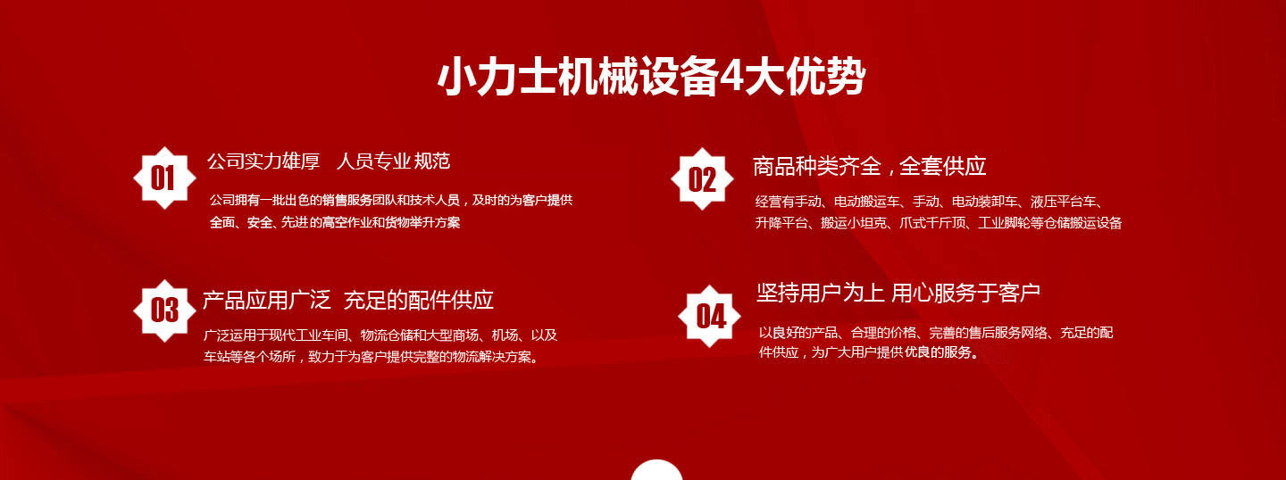 本公司致力于為廣大用戶(hù)提供快捷、低成本的物料搬運(yùn)設(shè)備、高空作業(yè)設(shè)備、儲(chǔ)存設(shè)備,以?xún)?yōu)良的產(chǎn)品、合理的價(jià)格、完善的售后服務(wù)、充足的配件供應(yīng),為廣大用戶(hù)提供快捷、完善的服務(wù)。【MORE】